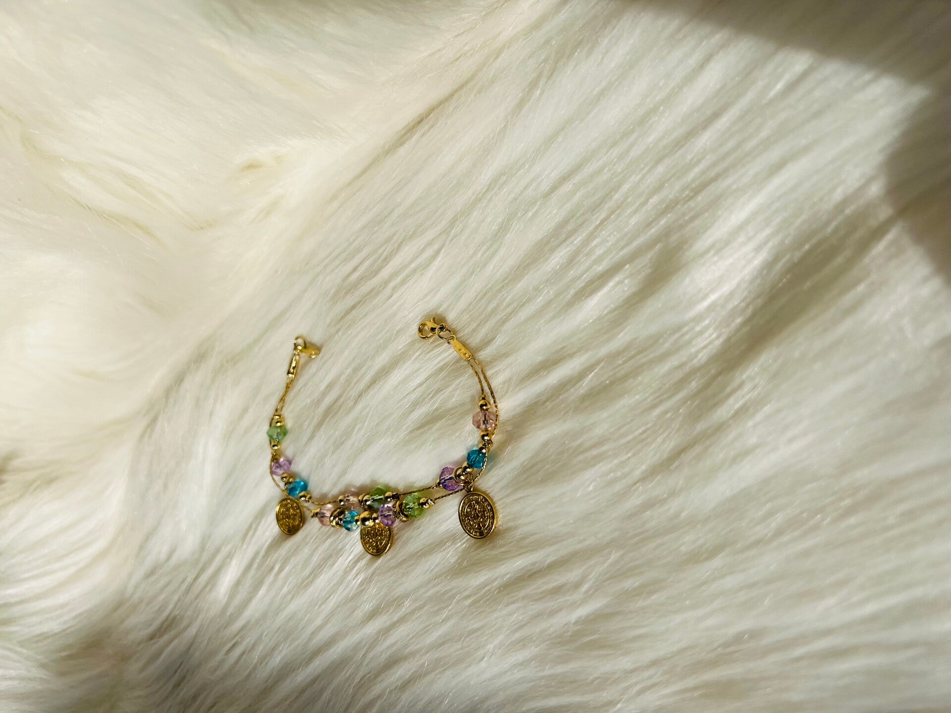 💕Hermosa pulcera de doble caída , con cristal , echo ha mano 💕