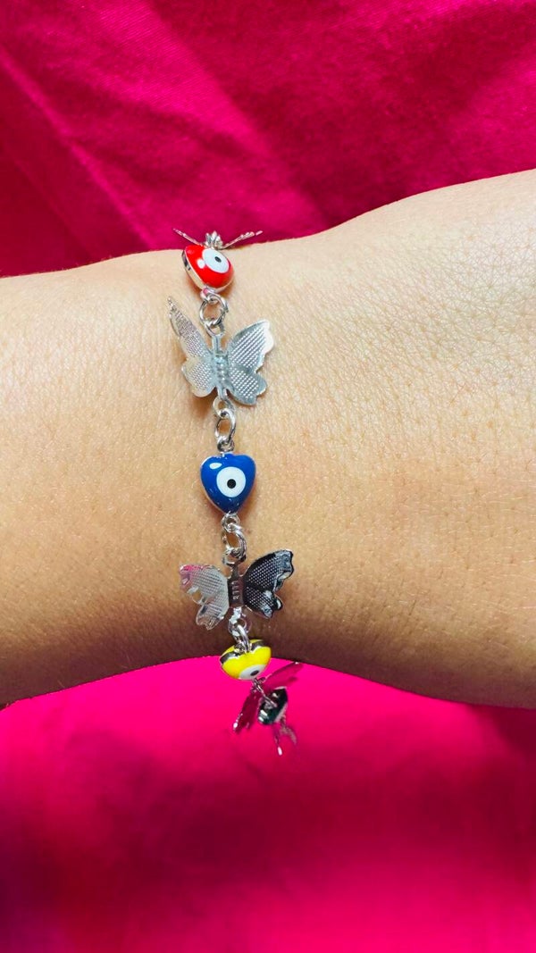 Pulsera de Ojoturco y mariposas tono platiado en Oro Laminado.